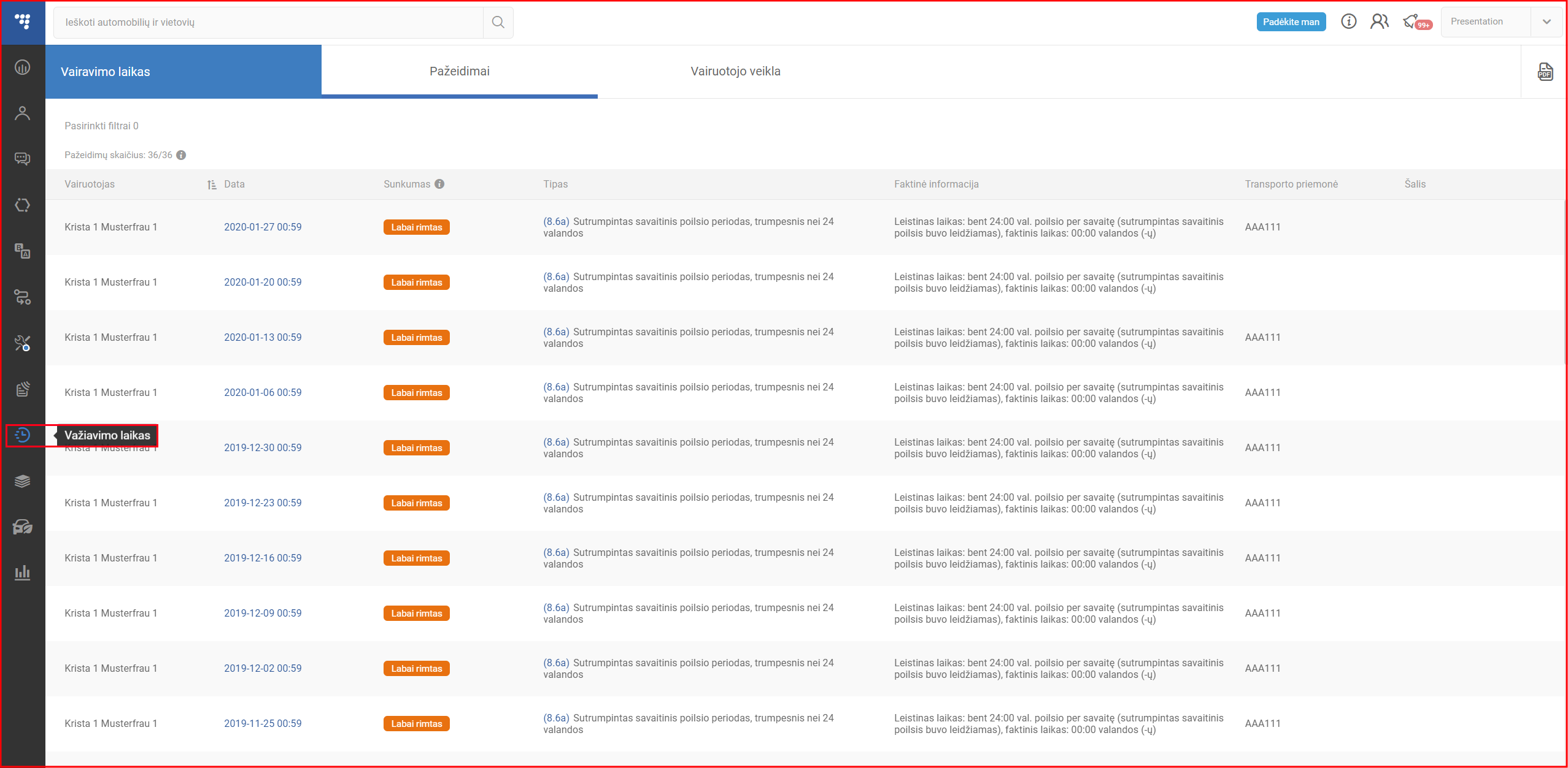 Vairavimo laiko funkcionalumas neapima su darbo laiku susijusių pažeidimų ir esant dviem vairuotojam.