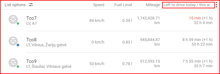 Sommige tijdanalysegegevens worden ook in andere delen van FMS weergegeven. De resterende rijtijd voor de huidige dag/week kan worden weergegeven in de voertuiglijst door de parameter “Resterende rijtijd vandaag/deze week” te selecteren. De tijd dat de limiet is overschreden, wordt in rood weergegeven.