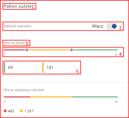 - Wartości (wyświetlane wartości zależą od wybranej opcji (litry, litry/100 km, punkty, zdarzenia itp.));